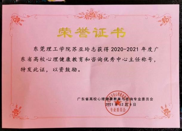 我校心理中心获评“2020-2021年度广东省高校心理健康教育与咨询工作先进集体”,这是我校第三次获此殊荣。同时,心理健康教育与咨询中心主任苏亚玲获“广东省高校心理健康教育工作突出贡献奖”与“广东省高校心理健康教育与咨询优秀中心主任”称号;党委学研工部、学生处处长黄金和主编的《高校危机事件应对理论与实践》获得“2021-2021年度广东省高校心理健康教育与咨询优秀出版物一等奖”;同时,心理中心专职教师欧阳晓莹获得“2020-2021年度广东省高校心理健康教育与咨询先进个人”称号。