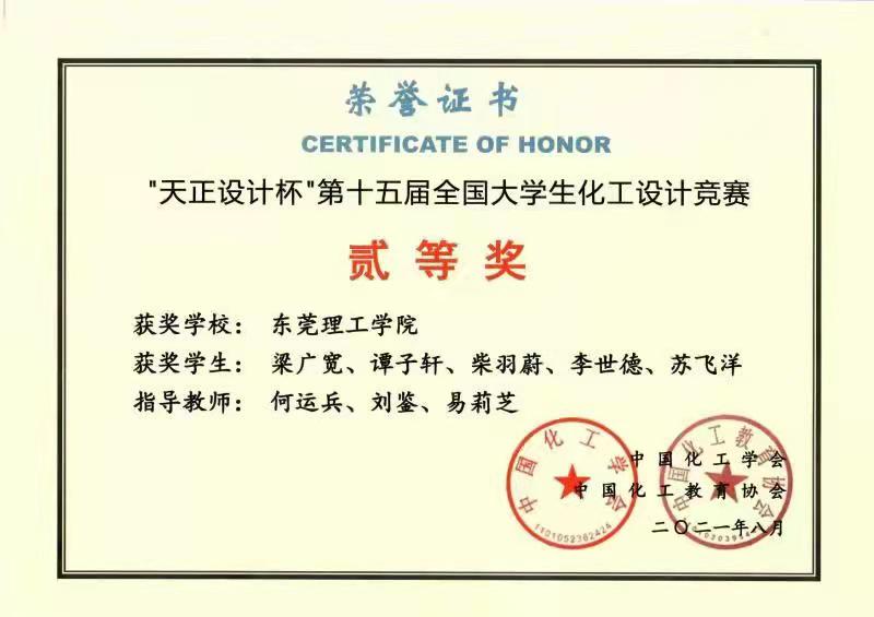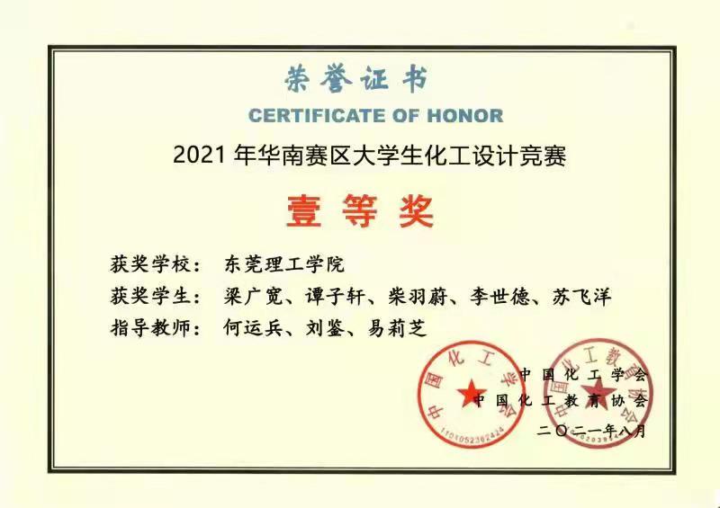 近日,全国大学生化工设计竞赛委员会传来喜讯,由化能学院化工系2018级学生梁广宽、谭子轩、李世德、苏飞洋、柴羽蔚五位同学组成的“纯醇欲动”团队(指导老师为何运兵、刘鉴和易莉芝)获得全国二等奖、华南赛区一等奖的优异成绩。