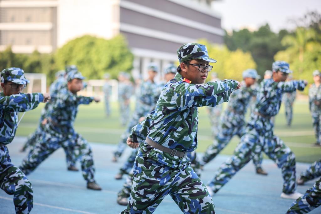 随后,伴随着响彻四方的呐喊声,2021级新生开始汇报表演,分列式、军体拳、匕首操、队列方阵表演、战术演练等项目尽显莞工学子豪迈气势和朝气蓬勃的青春风采。新生们拿出最饱满的精神,将这两周的训练成果展示出来;用最洪亮的声音,喊出青年人的精气神;用最有力的步伐,踩出精神抖擞的劲头。
