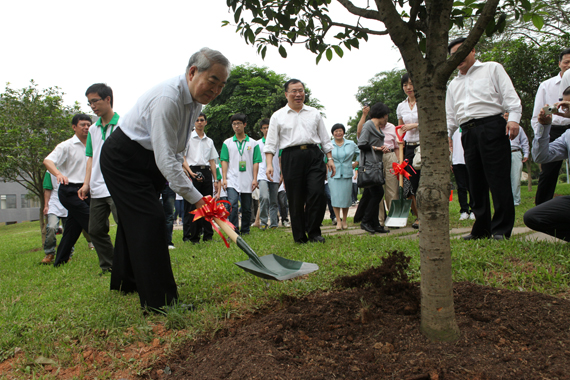 当天上午,杨振宁伉俪、范曾大师一行驱车来到院士林。一下车,他们便兴致勃勃地走到一棵罗汉松前,一同为罗汉松浇水。该棵罗汉松于2008年2月26日由杨振宁伉俪亲植,如今已是青葱翠绿,长高了不少。杨振宁博士还亲自用相机拍下这棵松树。杨振宁伉俪、范曾先后在罗汉松前留影,并与我校领导、校志愿者亲切合影留念。