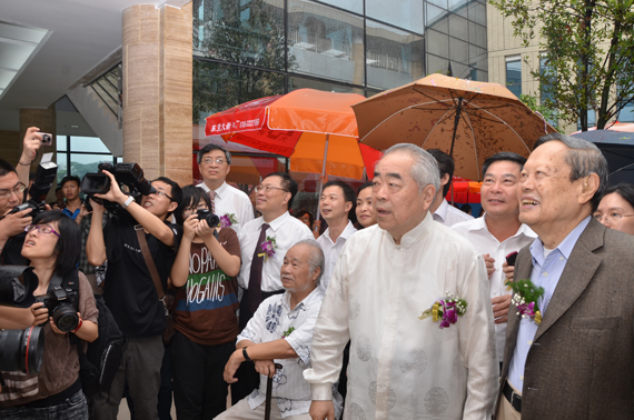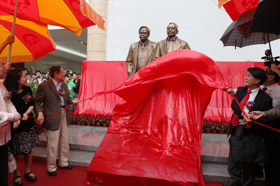 在彩带的映衬和掌声中,杨振宁夫妇,朱经武夫妇,范曾、潘鹤、陈和生、周致纳、杨晓西、黄贵洪共同为陈省身、杨振宁铜像揭幕。