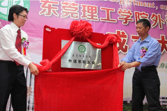 外语系党总支书记罗碧波与外语系校友会会长黎建华一同为校友会成立揭牌