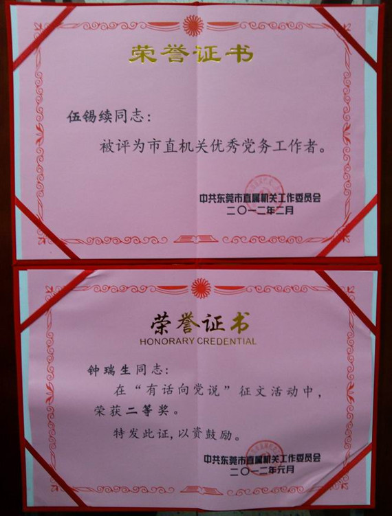 2月28日,东莞市直工委召开了全市市直机关党建工作会议,部署了2012年全市市直机关党建工作主题,并通报了2011年度市直机关党建工作量化考评先进单位及先进个人,我校体育系伍锡续同志被评为东莞市市直机关优秀党务工作者,钟瑞生同志在“有话向党说”征文活动中,荣获二等奖。