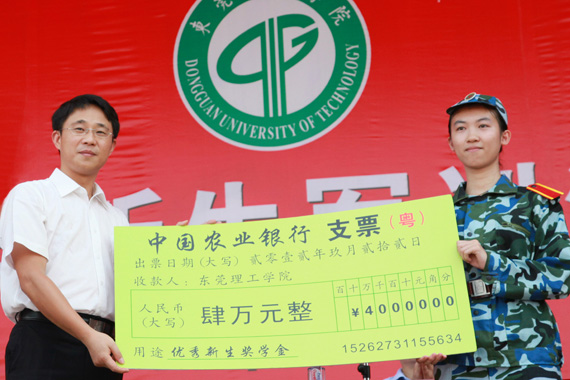 军训汇报表演后举行了开学典礼。成洪波、杨晓西分别为9名同学颁发了新生奖学金。其中,来自东莞的林晓君获得4万元新生奖学金,分四年发放,每年1万元;其他8位来自省外的同学获得1万元的新生奖学金。