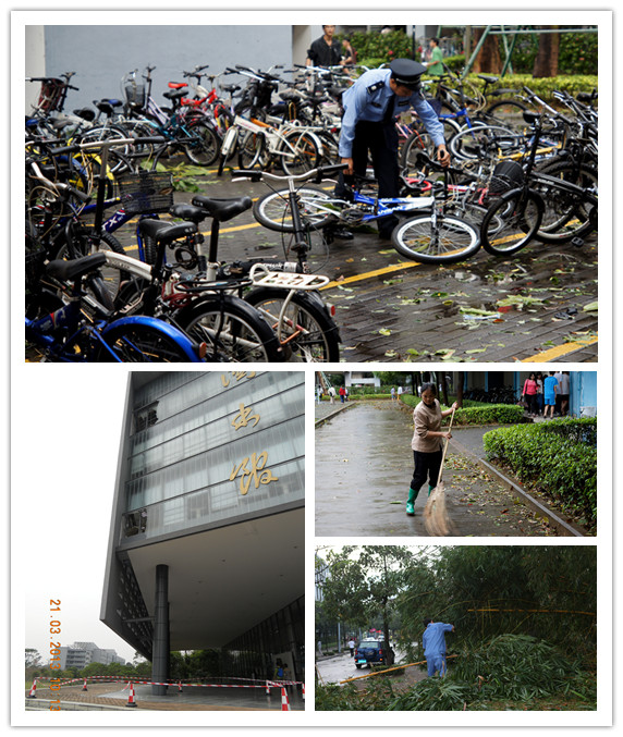 暴风雨过后,学校各院(系)立即发送紧急通知,通过飞信、QQ、微博等形式了解学生安全状况。保卫处、资产后勤管理处、后勤集团等部门相关负责人也迅速到校园各处查看校园受损情况,对安全隐患进行紧急处理和抢修,同时做好安全防范措施,避免发生意外;还组织员工连夜开展校园清扫工作。