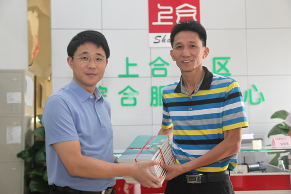在上合村,成洪波一行与望牛墩镇党委书记黄庆辉等镇村两级干部、帮扶对象代表座谈,就如何帮助上合村贫困户脱贫致富的事宜商议了意见和建议,并向上合村赠送近260册书籍。
