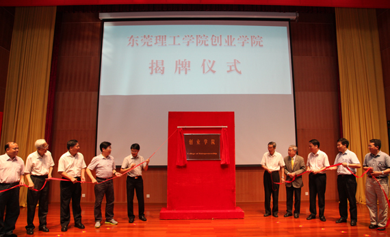 我校党委书记成洪波,市政协原主席、老市长郑锦滔,市政协原主席、我校老书记刘树基,我校党委副书记、校长李琳,省政协委员、我校老书记周致纳,老校长张遐龄,东莞市外商投资协会会长朱国基,校党委副书记吕琦元、安少华,创业学院院长路晓军等共同为创业学院揭牌。