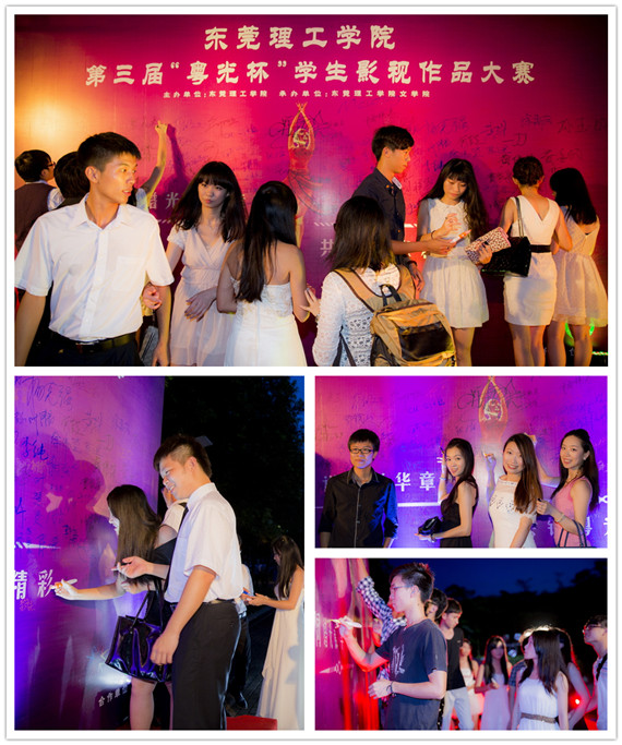 盛装走红地毯,在签名墙上签名并留影,然后走进颁奖典礼的会场,红地毯两旁则闪光灯闪不停,掌声、欢呼声此起彼伏……这在影视颁奖晚会中常见的场面,6月7日晚,在我校热烈上演。这就是由我校文学院承办的、被誉为“莞工奥斯卡”的第三届“粤光杯”学生影视作品大赛颁奖晚会。