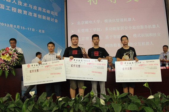 我校计算机学院派出三支队伍参加比赛,经过精心准备,努力拼搏,取得优异成绩,分别获得特等奖、二等奖和三等奖。其中,我校学生作品《多功能家居安全监控服务机器人》(队员:覃梓生、李浩建、李树茂、梁广平、赵子清;指导老师:黄培灿)获得特等奖;《消防机器人》(队员:苏剑悦、陈晓耿、张再响、吴妙灵;指导老师:洪小宇 )获得二等奖;《六足智能仿生机器人》(队员:吴金标、詹增煜、肖楚钊、吴侠志、李旭锐;指导老师:赵维佺)获得三等奖。