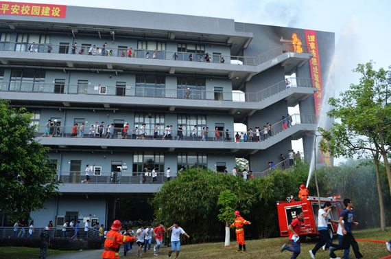 11月7日下午4:30分,我校机电楼化环学院某实验室突然“起火”,顿时浓烟滚滚,警铃响起。保卫处接报后,立即出动水罐消防车,消防特勤组和校卫队员也第一时间赶赴现场,迅速组织疏散人群,对初起火灾进行扑救。600多名被困人员迅速而有序地从着火大楼撤离。随后,校卫队员在着火大楼搜救出数名被困人员,并使用担架将其顺利救出。最终,“大火”被扑灭。