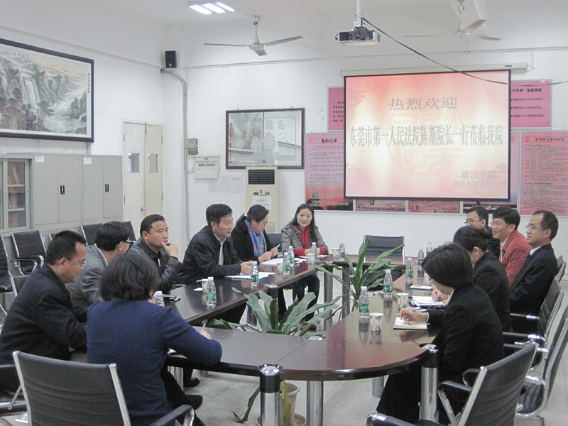3月5日,东莞市第一人民法院院长陈斯一行来到我校调研。我校党委副书记、纪委书记、副校长安少华,政法学院部分法学专业教师参加了座谈会。