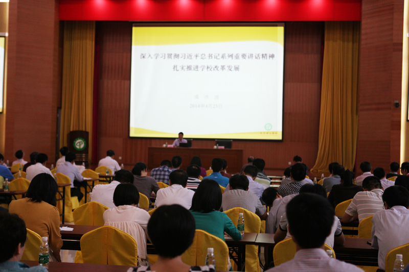 4月23日至24日,我校在会议中心举办学习贯彻习近平总书记系列重要讲话精神培训班。党委书记成洪波向参会教职工作了题为《深入学习贯彻习近平总书记系列重要讲话精神扎实推进学校改革发展》的专题报告,中山大学原校长黄达人教授就大学的定位和未来发展趋势作了专题报告。