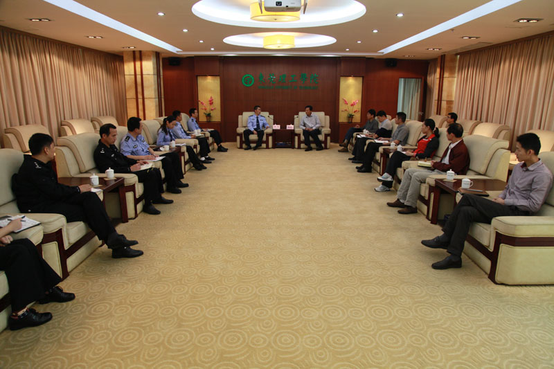 4月4日,松山湖公安分局局长张策一行到我校开展党的群众路线教育实践活动调研工作,副校长戴炳源,保卫处、学生处、化学与环境工程学院相关负责人参加了座谈。 在座谈交流中,双方就如何加强松山湖社会治安综合管理和建设平安校园等方面进行了深入的交流探讨,对我校参会代表提出的一些想法和建议,松山湖公安分局相关负责人一一进行了回应和解答。 戴炳源向松山湖公安分局一直以来对我校安全工作的重视和支持表示感谢,希望双方以后继续加强合作交流,共同建设平安校园、平安松山湖。