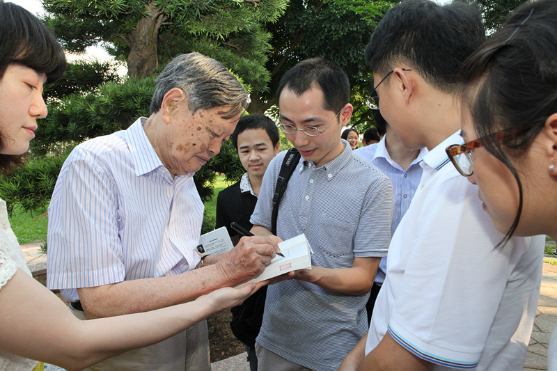 杨振宁博士亲切地与在场青年教师代表和学生代表交流,询问学生的学习情况和学校专业设置情况,并与我校领导、青年教师代表和学生代表在罗汉松前合影留念。