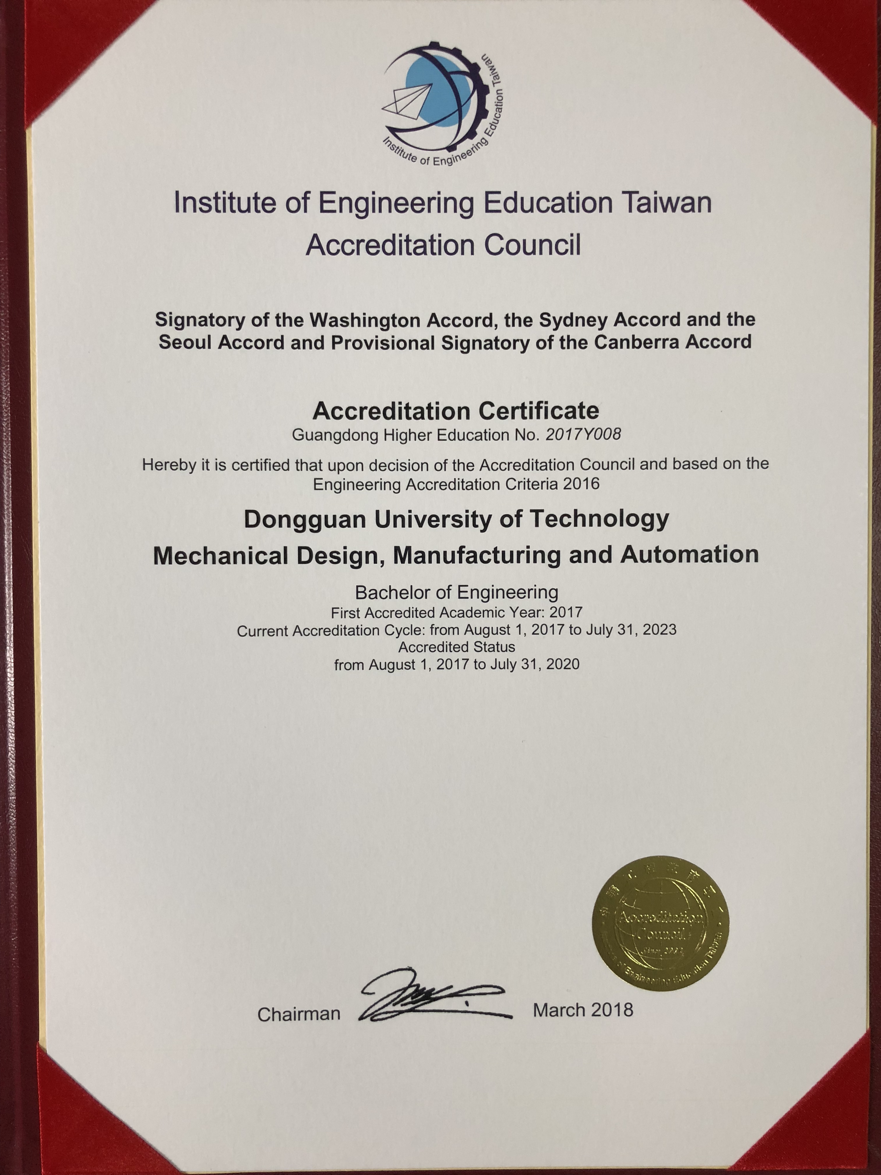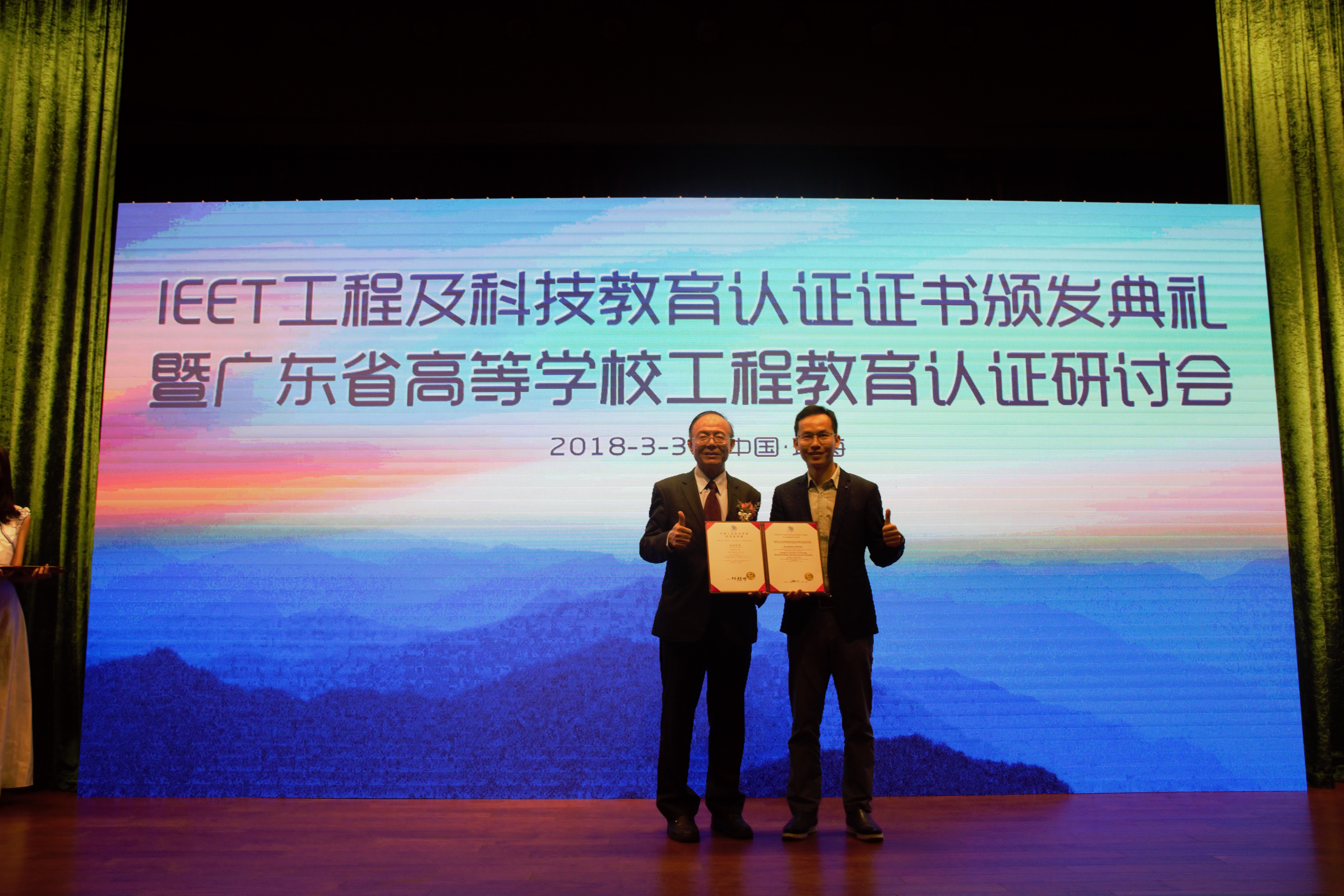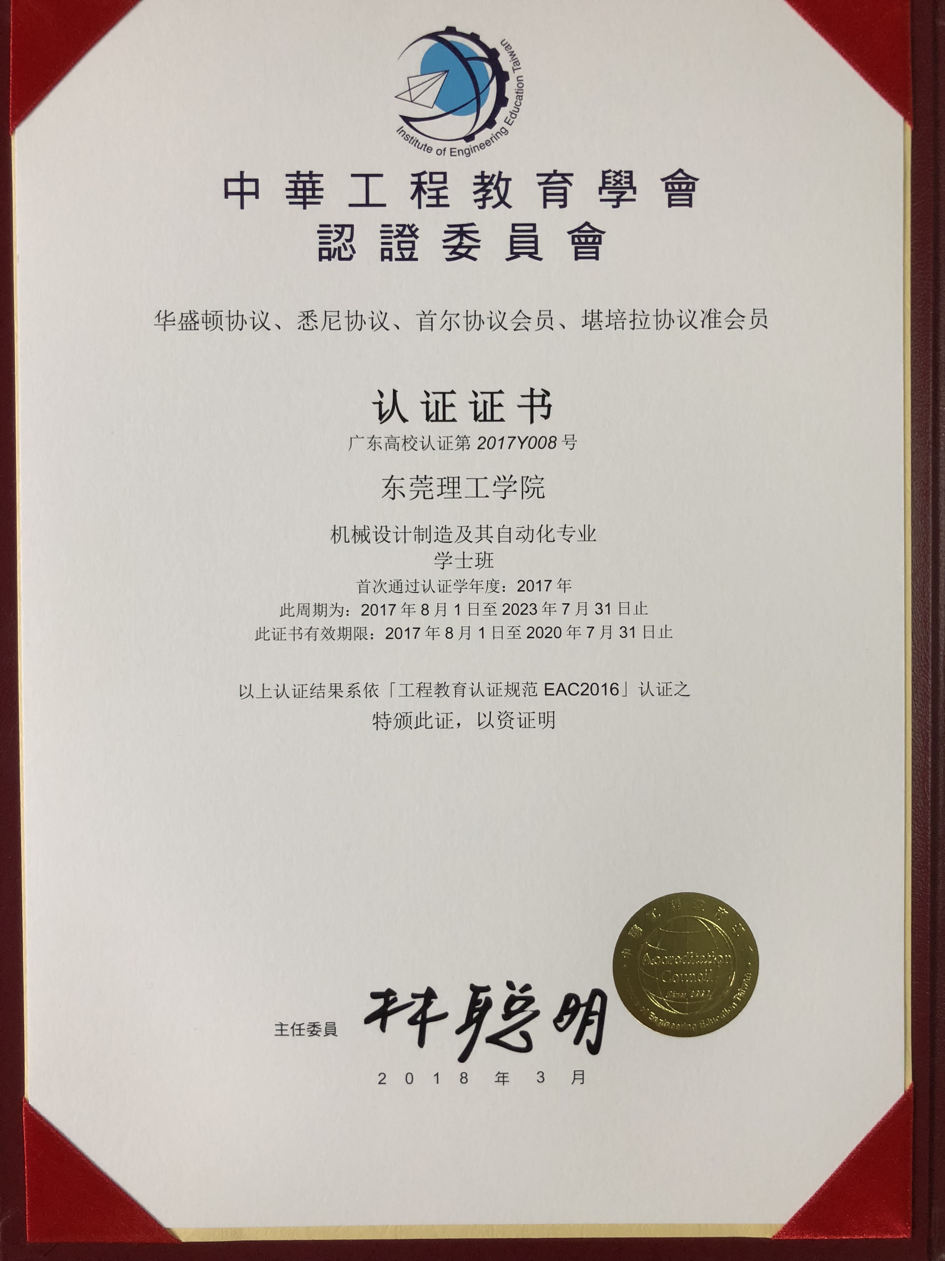 3月31日,IEET工程及科技教育认证证书颁发典礼暨广东省高等学校工程教育认证研讨会在北京理工大学珠海学院召开。包括我校机械设计制造及其自动化专业在内的广东省首批19个高等院校共25个专业通过认证,IEET主任委员林聪明教授亲自为通过认证专业颁发认证证书。机械设计制造及其自动化专业是我校第一个通过工程教育认证专业,将为我校其他专业参加IEET工程教育认证起到良好的示范作用。