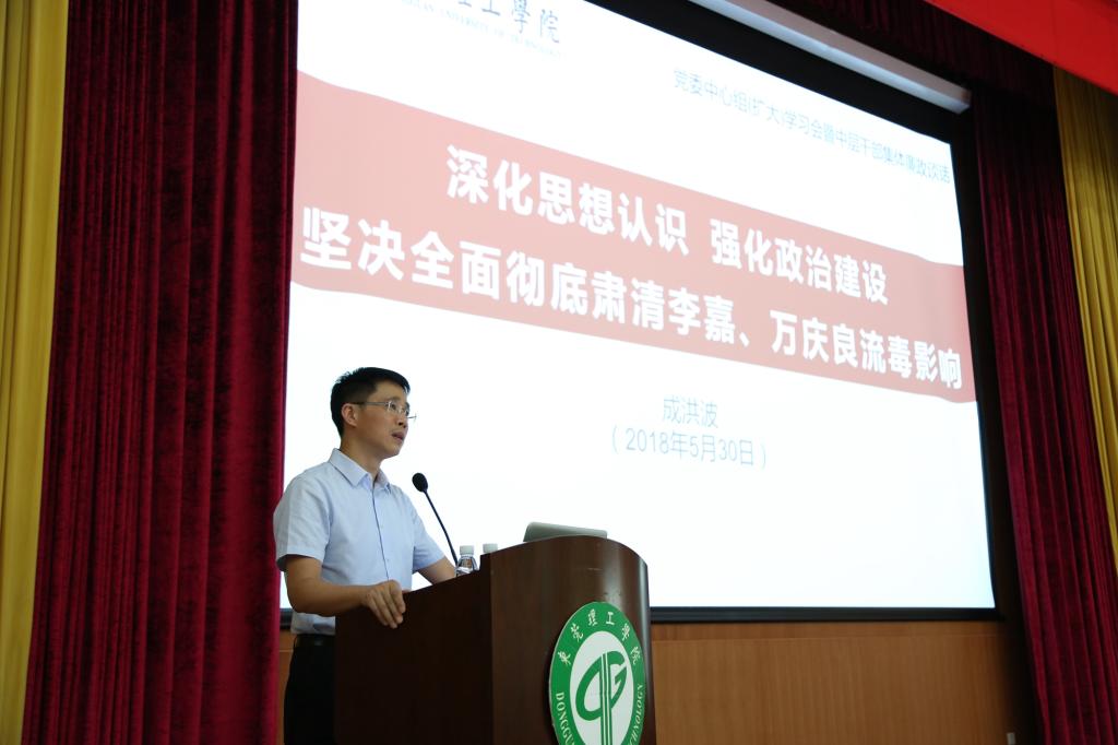 5月30日,我校举行的党委中心组扩大学习会暨中层干部集体廉政谈话会上,校党委书记成洪波为校党委委员、全体中层干部上专题党课,要求坚决全面彻底肃清李嘉、万庆良流毒影响,深化思想认识,强化政治建设。