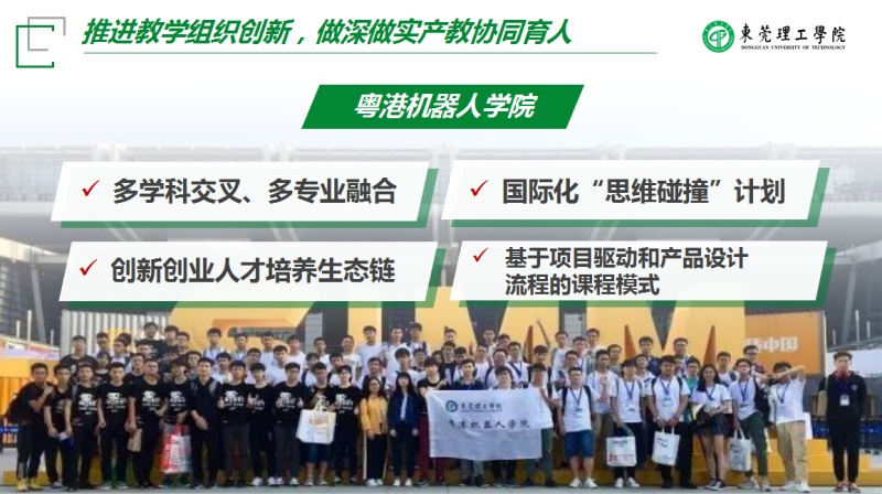 二是建设新兴学科专业集群,提升服务支撑产业能力。学校围绕智能制造产业链优化专业结构,加强内涵建设,新增机器人、网络安全、智能控制等专业14个,改造传统工科专业9个,促进了学科交叉融合,提升了服务支撑产业能力,为培养实干型人才打下坚实基础。在东莞市推进企业“机器换人”、实施重点企业规模效益“倍增计划”中,我校教师团队为政府部门和2200多家企业提供了专业化服务。学校与东莞市横沥镇共建“模具产业协同创新中心”“先进机械(模具)制造应用型人才协同培养基地”,共建实验室15个,400多名学生在基地实习、就业、创业,孵化一批创新型企业。横沥镇的协同创新项目获得2016年广东省科学技术奖特等奖。