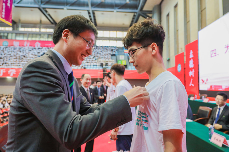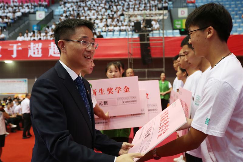2018级新生中,共有18位新生获得新生奖学金,其中,计算机与网络安全学院的陈壮耀获得5万元新生奖学金,其他新生获得了每人1万元的奖学金。成洪波为新生颁发奖学金,各二级学院负责人为新生代表佩戴学校校徽。