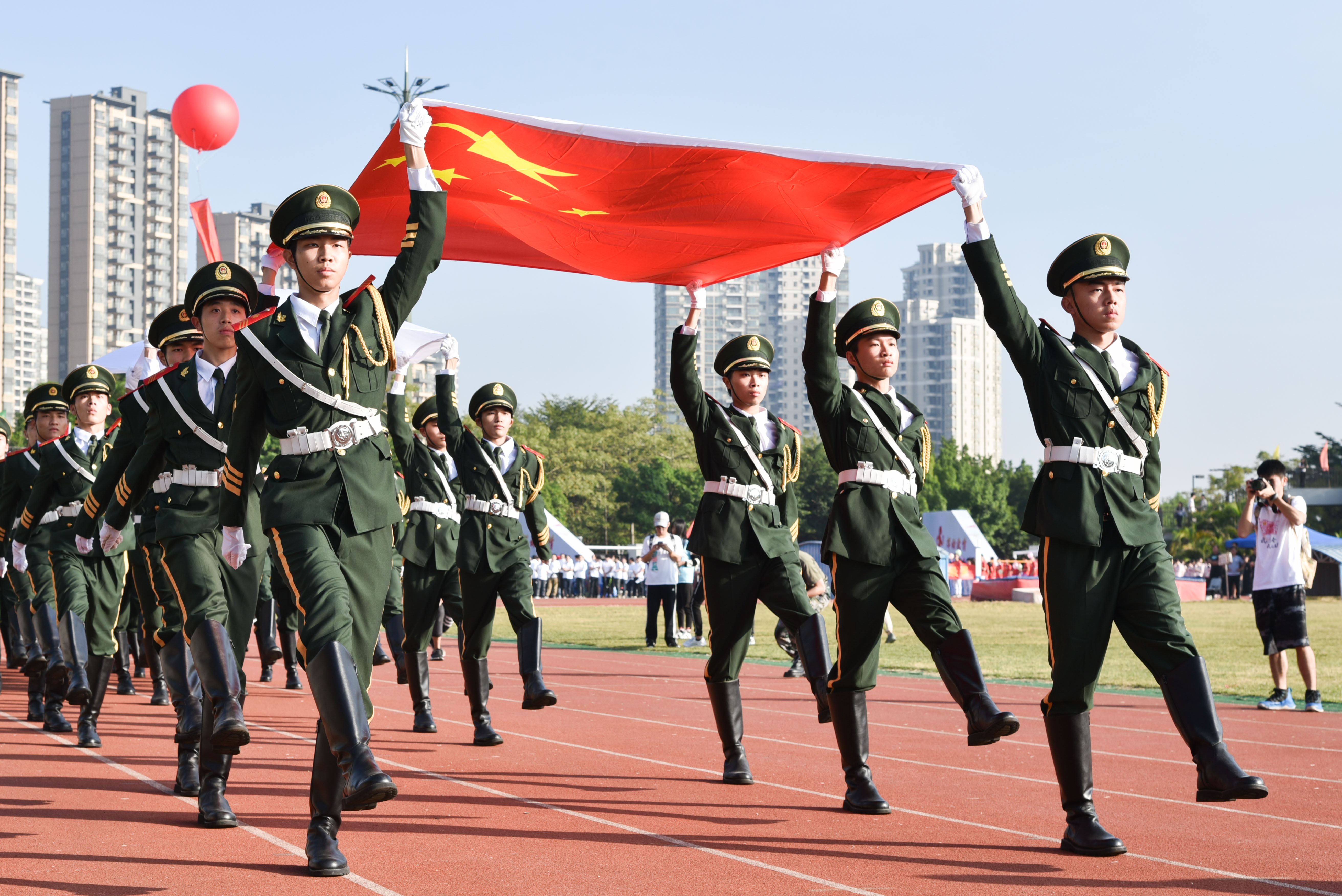 集合两校区共61人的国旗护卫队完成了此次开幕式的升旗仪式。这是两校区国旗护卫队首次共同在赛场上亮相。他们的出现,使校运会更添庄严与隆重。他们踏着整齐的步伐走来,双手紧握国旗,坚毅的目光直视前方,雄壮的国歌声响起时,是对国家的尊重也是对校运会的重视。