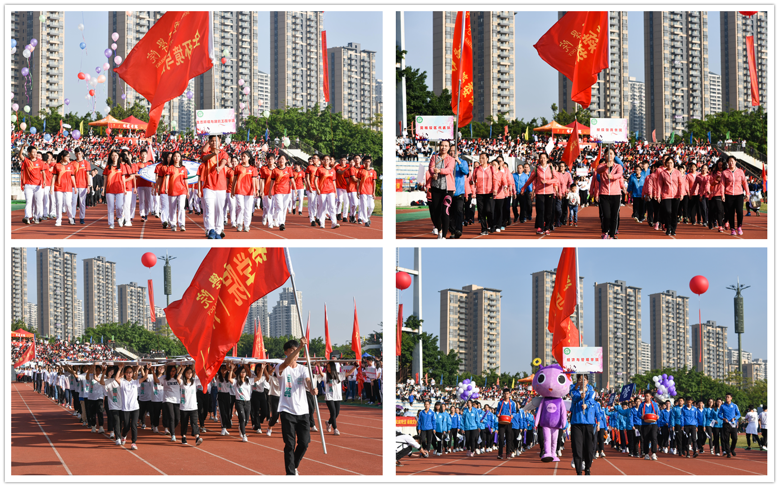 学校气球方阵,五彩的气球引人注目。环建学院的氢气球方阵,以放飞气球,放飞理想为特色。电智学院则以吉祥物代表电智学院的精神风貌,鼓声让人为之震撼。各具特色的方阵队伍,无不展现了莞工学子的别样风采。