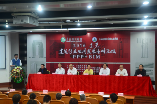 11月4日至5日,由我校主办的“首届东莞地区建筑行业协同发展高峰论坛暨‘PPP+BIM’发展研讨会”(PPP:政府和社会资本合作;BIM:建筑信息模型)在松山湖校区学术交流中心举行。本次论坛是在广东省住建厅,东莞市住建局、城建局等各级部门的指导支持下,由生态环境与建筑工程学院和深圳市斯维尔科技股份有限公司共同承办,广东中量工程投资咨询有限公司协办,共有来自省市政府单位、广东省工程造价协会、东莞市土木建筑学会、各行业协会、台湾中华智慧房地产教育协会及广东中建科技有限公司、万科集团、光大集团、陕西建工集团等大中型企业的100多位领导、专家参会。