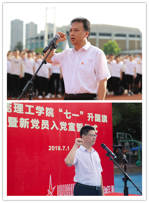 两校区的宣誓仪式分别由马宏伟和李文芳进行领誓,全体新老党员面对党旗,举起右手,以高昂的声音重温入党誓词。百字誓词虽短,但每一个字都铿锵有力地宣读出来,这是每位新党员入党后对党的第一个承诺,也是庄严神圣的第一课,这是中国共产党使命与责任的延续与传承!
