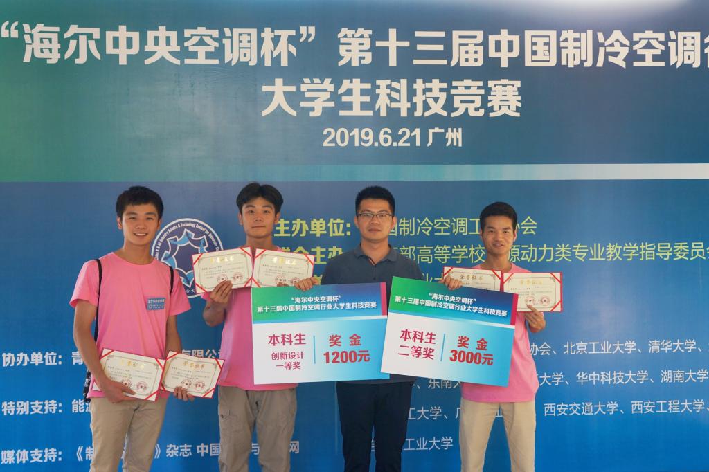 我校王文豪老师带领化学工程与能源技术学院学生吴东周、芮澎恩、芮澎思组成的“松山湖队”经过两天的激烈角逐,最终斩获“海尔中央空调杯”第十三届中国制冷空调行业大学生科技竞赛创新设计一等奖以及竞赛总分二等奖。