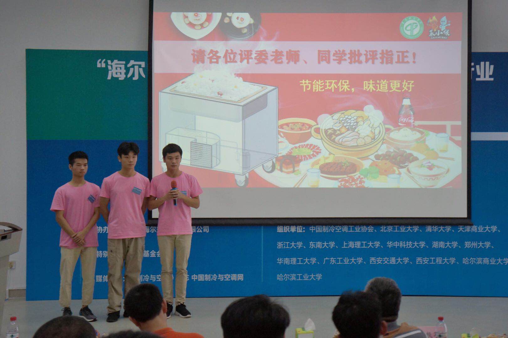 在比赛过程中,我校化能学子运用课程所学知识解答了包括工程热力学、工程流体力学、制冷原理、通风与空气调节工程等学科知识的竞赛题目。在“创新设计作品答辩时”我校学生设计的一种基于空气源热泵技术的节能保温餐车——“菜小保”引起评委的关注并获得肯定。