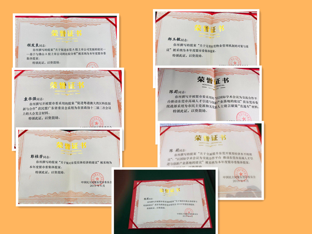 我校盟员程发良撰写的《东莞高层次人才引进的问题与对策建议》代表市盟作为2018暑期座谈会发言材料;袁华强撰写的《促进粤港澳大湾区科技创新与合作》获民盟省委员会采用并作为在省政协十二届二次会议上的大会发言材料;陈佰满、谢世磊、陈莉撰写的《以国际学术会议为交流合作平台推动东莞市高端人才引进与创新产业落地的建议》获市委统战部采用为市民主党派和无党派人士建言“直通车”材料;陈莉撰写的《关于城市垃圾分类收集与奖惩的建议》被盟市委采用,并评为政协常委会重点提案;程发良撰写的《关于促进东莞市A股上市公司发展的建议—基于与佛山A股上市公司的比较分析》、彭桂芳撰写的《关于振兴东莞实体经济的建议》、陈莉撰写的《关于全面提升东莞开放型经济水平的建议》、郑玉敏撰写的《关于完善东莞物业管理机制的对策与建议》分别被采纳为本年度盟市委集体提案。陈莉、陈佰满撰写的《人民政协在推进国家治理体系和治理能力现代化中的作用》荣获广东省政协系统“深入学习习近平总书记关于加强和改进人民政协工作的重要思想学习研讨活动”论文三等奖。