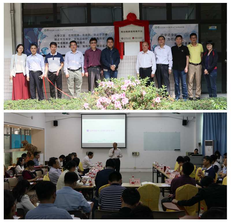 现场会还举行了粤台跨境电商平台揭牌仪式,吕琦元、黄金和、陈伟及各二级学院党总支副书记等,共同为粤台跨境电商平台揭牌。