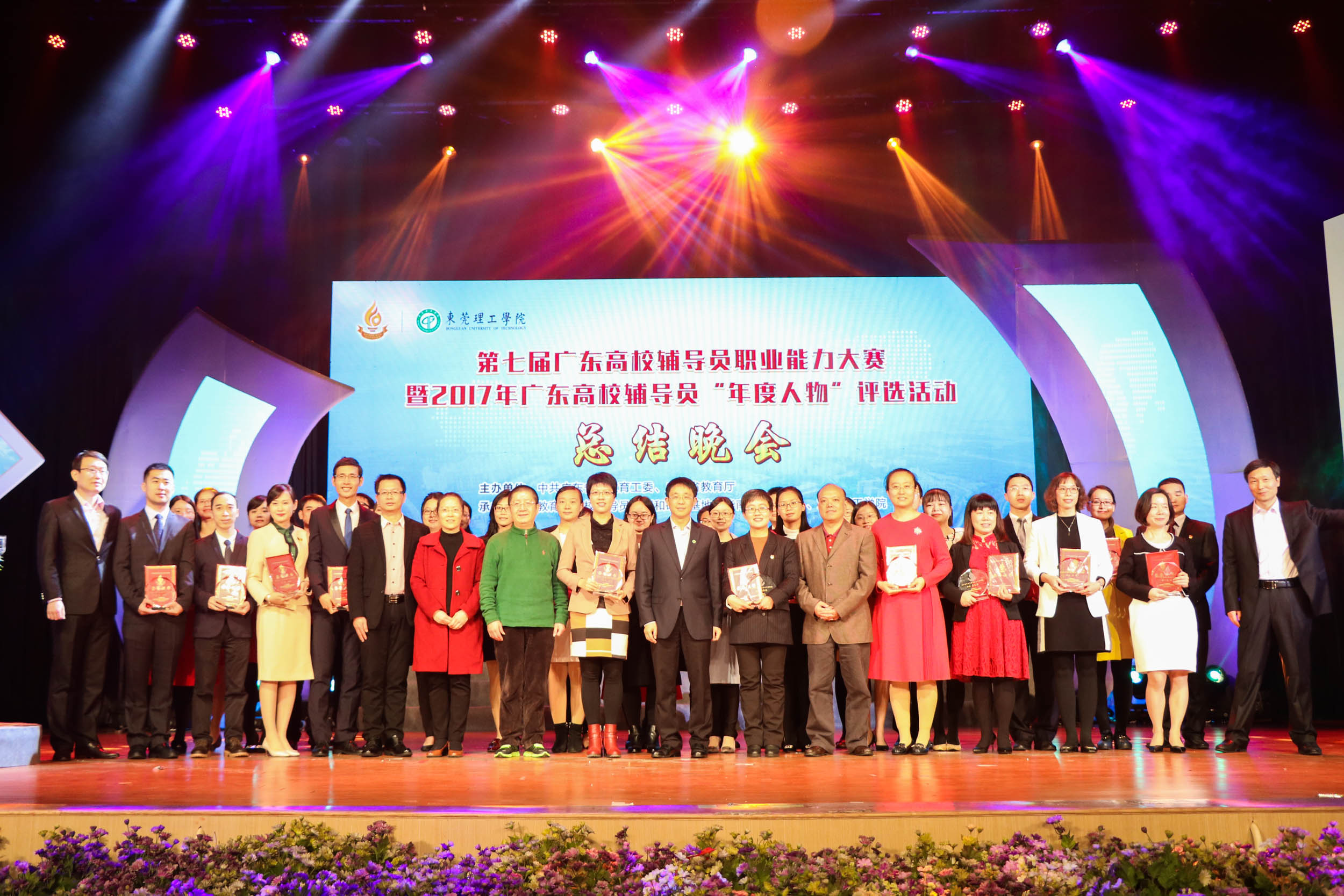 1月7日晚,第七届广东高校辅导员职业能力大赛暨2017年广东高校辅导员“年度人物”评选活动在我校大礼堂隆重举行。广东省教育厅思想政治工作与宣传处处长袁本新,我校党委书记成洪波,党委副书记吕琦元,教育部高校辅导员培训和研修基地常务副主任、华南师范大学博士生导师魏则胜,广东省高校心理健康教育与咨询委员会常务副主任梁瑞琼,广东省高校易班发展中心常务副主任余俊渠处长与大赛部分评委、专家、参赛辅导员、我校学工队伍一同参加了总结表彰晚会。