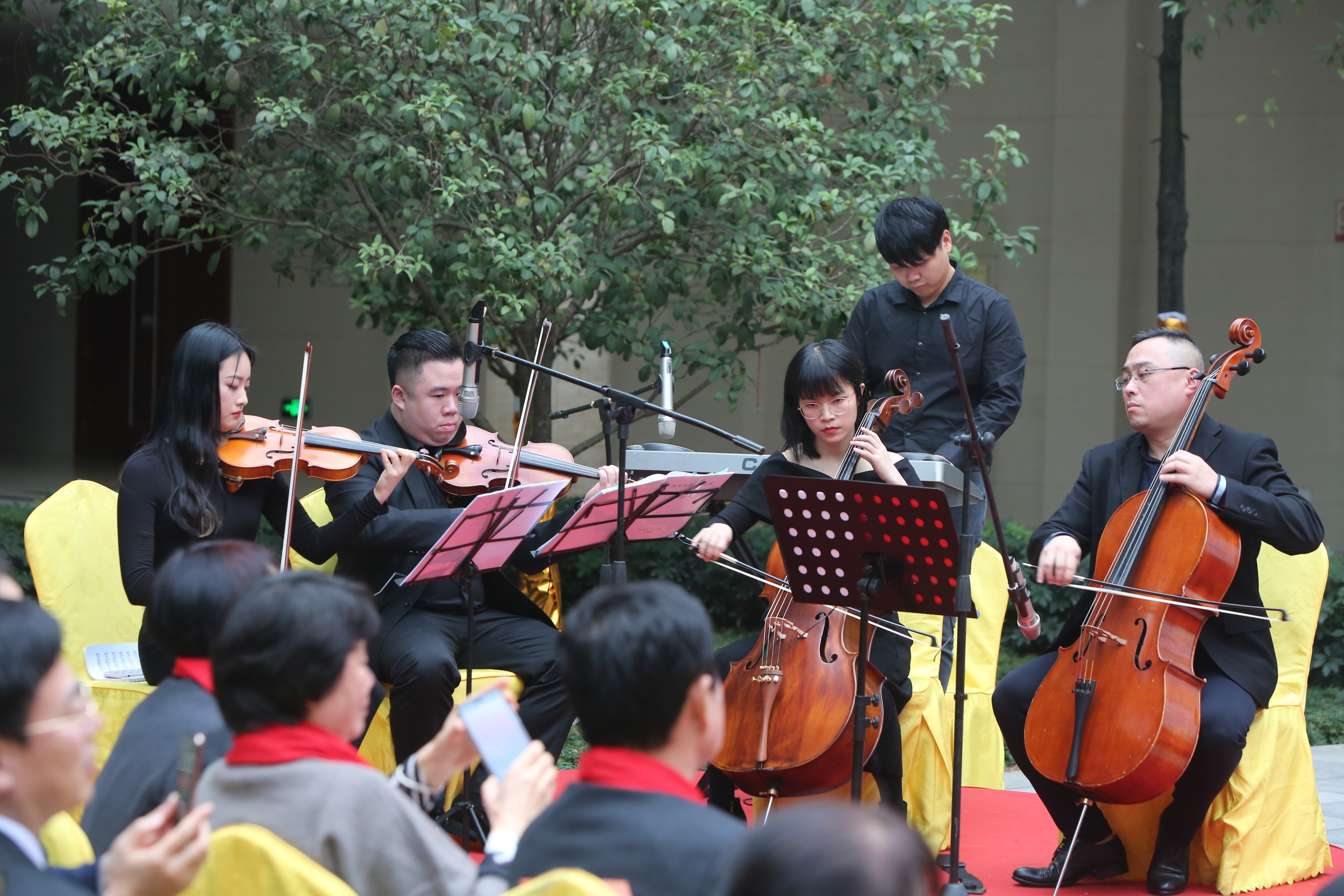 青年大提琴演奏家、我校教育学院(师范学院)教师颜乐博士率领团队在现场为典礼伴奏。他曾多次参与国内外的大提琴表演和室内乐表演,并和多个交响乐团合作大提琴协奏曲,深受好评;也曾在学校各大活动中表演,尤其是今年3月,他应邀为到访我校的汤加国王图普六世表演,受到了国王的赞扬。