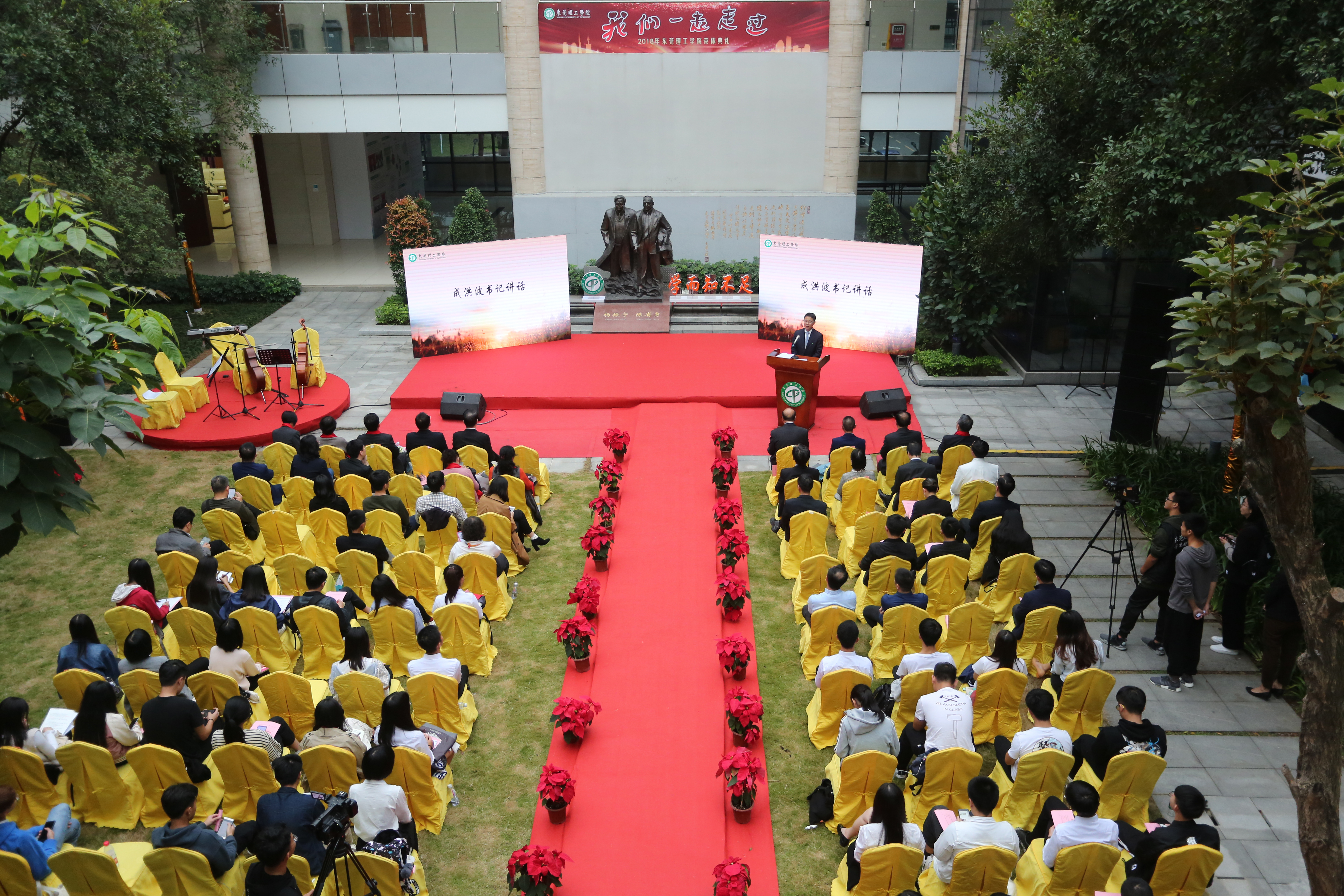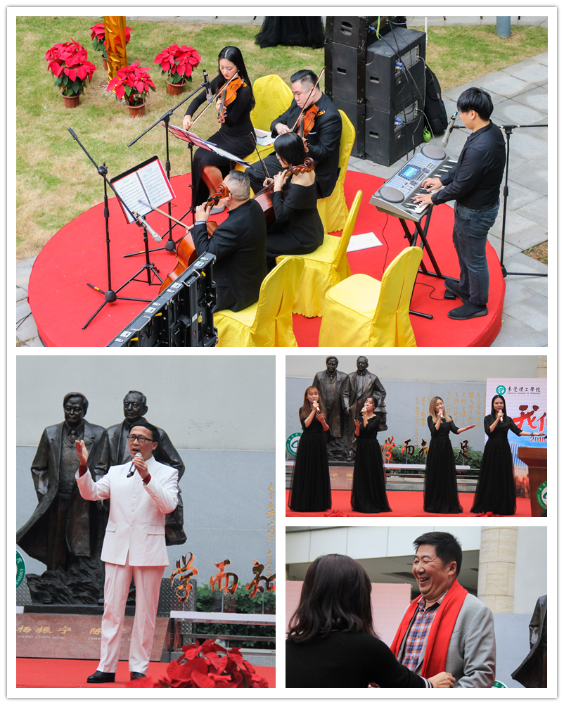 这是我校第二年举行荣休典礼。有别于去年在室内举行,今年特别安排在了会议中心中庭举行。中庭是本校科学精神、人文精神之高地,这里有著名科学家陈省身、杨振宁等两位先生铜像,当代著名书画家、诗人范曾先生的诗篇,而铜像本身融汇了雕塑大师潘鹤父子的智慧结晶。