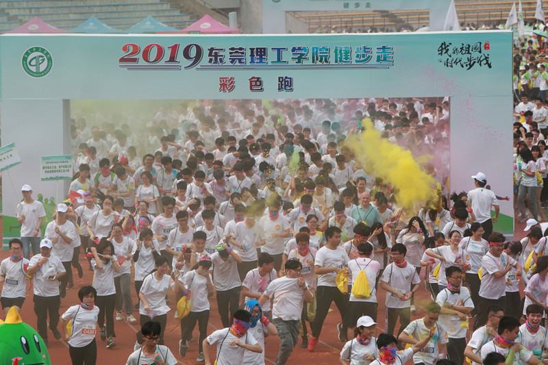 4月28日,面对几天来难得的好天气,4800多名莞工师生校友齐聚操场,以健步走的方式祝福新中国成立70周年、纪念五四运动100周年、庆祝莞工27岁生日。本次活动是我校今年开展的“我的祖国”爱国主义主题教育活动之一。活动分彩色跑、健步走、大行进三部分。其中“健步走”主要是沿松山湖校区校园、松山湖中学绿道环校走,全程约6.2公里;“彩色跑”的路线为松山湖校区的校内道路,全程约3.3公里;“大行进”主要围绕莞城校区校园行走,并在指定点签到打卡。