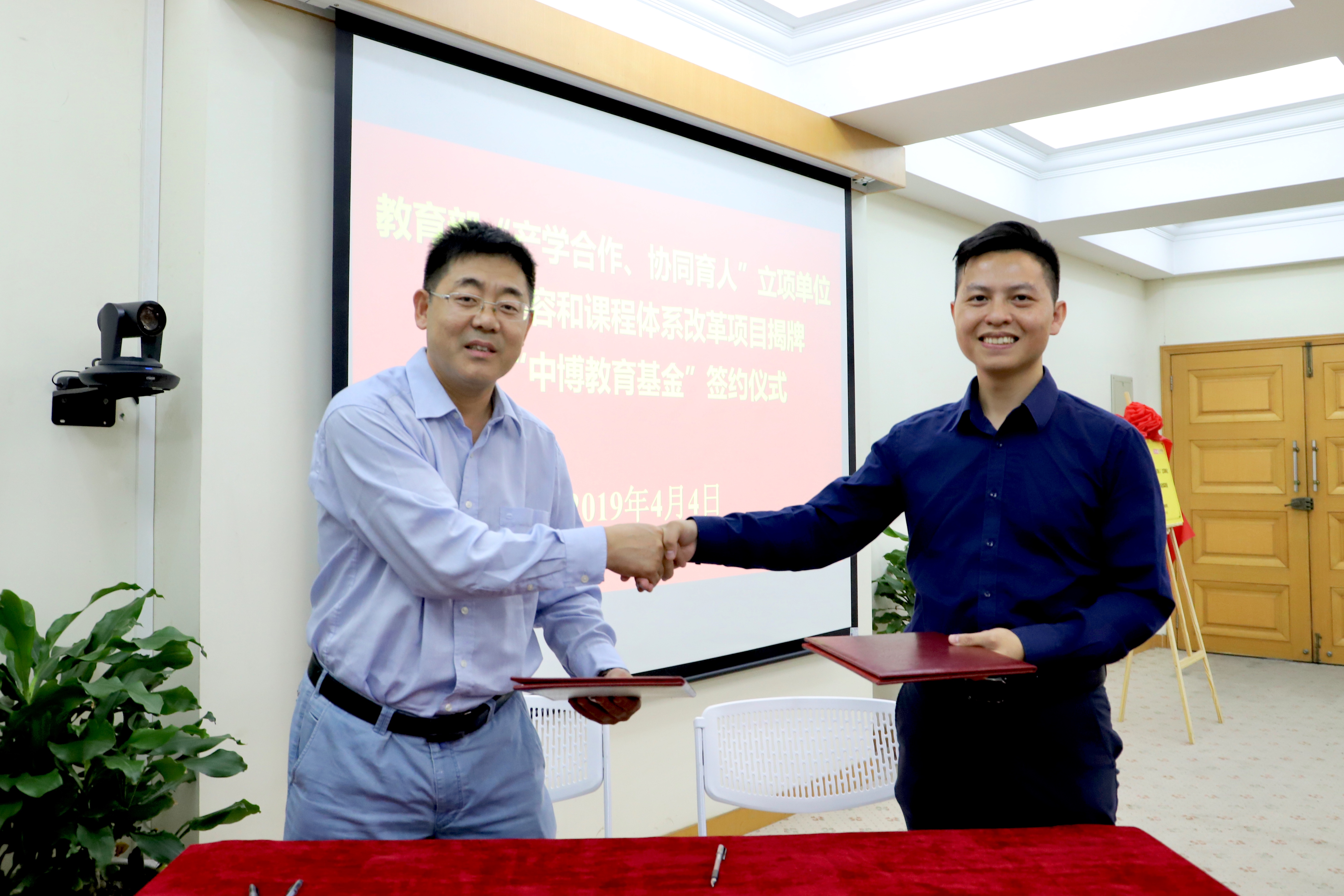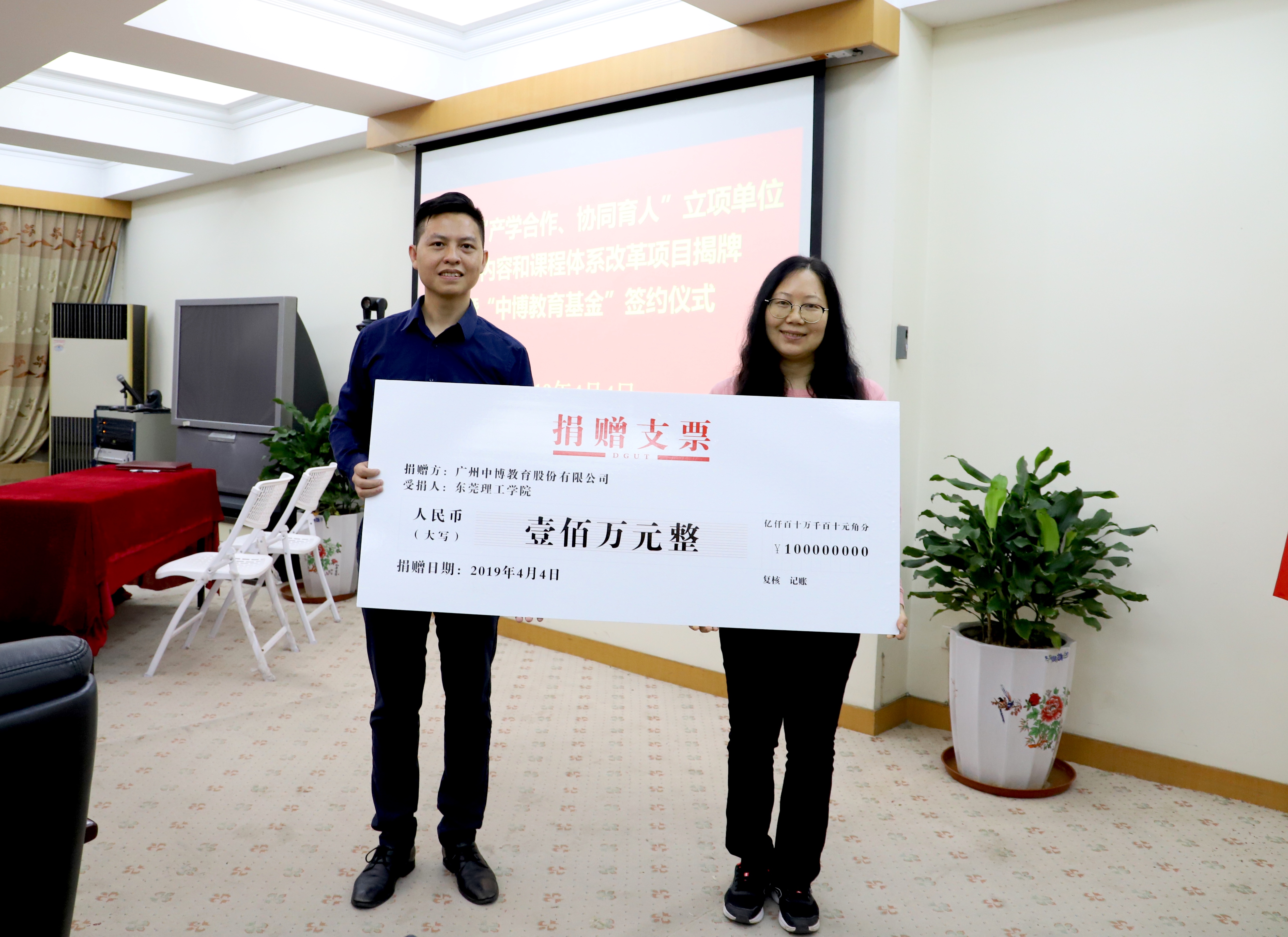 吕琦元与中博教育负责人共同揭牌。崔学海与中博教育负责人签订中博教育基金捐赠协议。经济与管理学院院长刘继云从广州中博教育股份有限公司副总经理杨智浩手中接过100万元的捐赠支票。