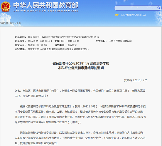 近日,教育部发布了《教育部关于公布2018年度普通高等学校本科专业备案和审批结果的通知》(教高函〔20197号),我校推荐申请设置的数据科学与大数据技术(080910T)、智能制造工程(080213T)、建筑环境与能源应用工程(081002)、食品科学与工程(082701)等四个本科工科专业成功获批。