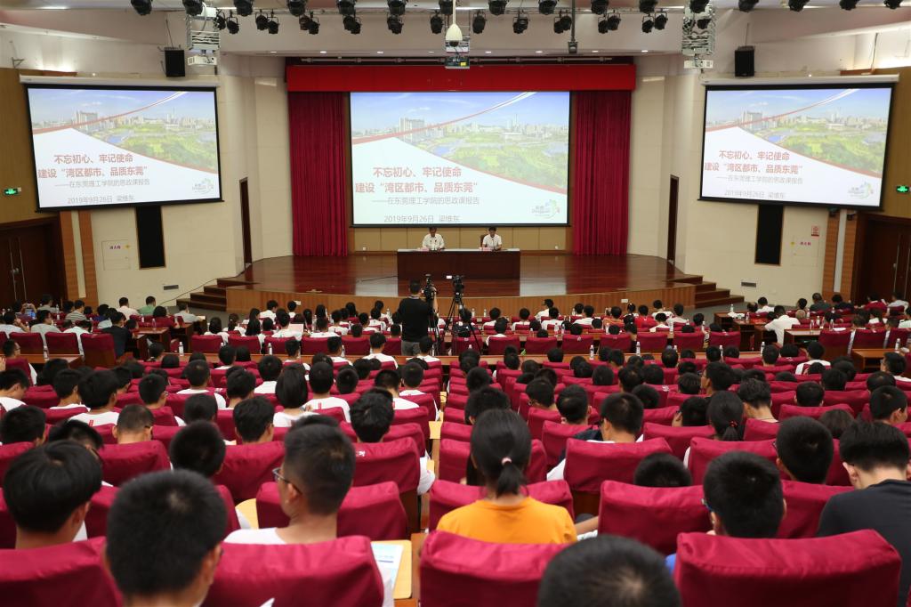 9月26日上午,东莞市委书记、市人大常委会主任梁维东来到我校,调研特色育人平台,为师生讲授思政课,推动“不忘初心、牢记使命”主题教育深入开展。梁维东勉励我校师生要坚定理想信念,练就过硬本领,扎根东莞、服务东莞,在新时代东莞改革开放中施展才华、建功立业。