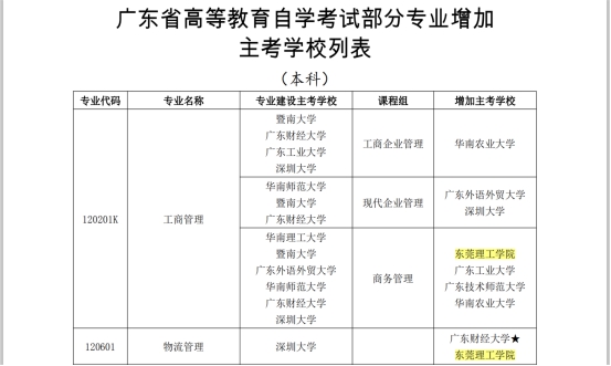 近日,广东省自学考试委员会发布了《关于广东省高等教育自学考试部分专业加主考学校的通知》(粤考委〔2019〕1号,我校取得零的突破,获得广东省高等教育自学考试主考学校资格。