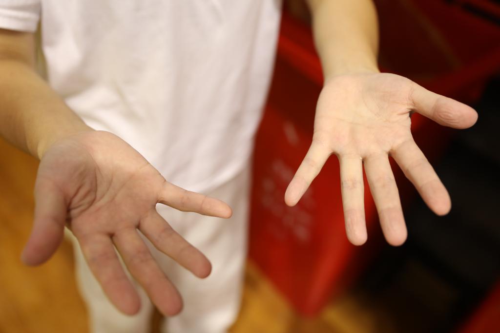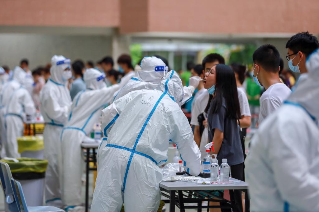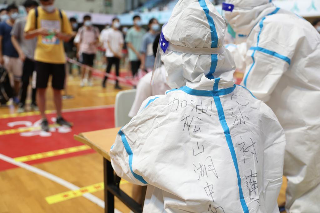 脱下厚重的防护服,浑身大汗的医务人员手关节早已因长时间的重复性动作而变得肿胀,脸上的皮肤也被口罩勒出了道道红色印记。在结束了核酸检测采样后,疲惫让他们只能就近休息。尽管检测任务艰辛、抗击疫情过程艰巨,医护人员仍然保持着积极的心态,在防护服背后写下鼓舞人心的振奋话语或一个个温暖的名字。