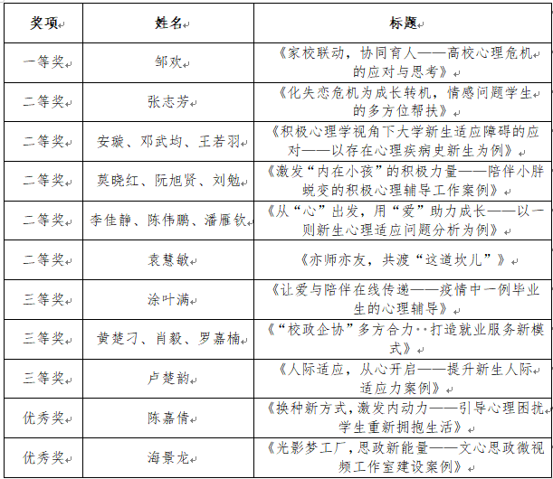 近日,由广东省高校思想政治工作队伍培训研修中心、广东省高等学校思想政治教育研究会组织开展的广东高校学生工作优秀案例评选结果公布,我校选送的11项成果全部获奖,其中一等奖1项、二等奖5项、三等奖3项、优秀奖2项。