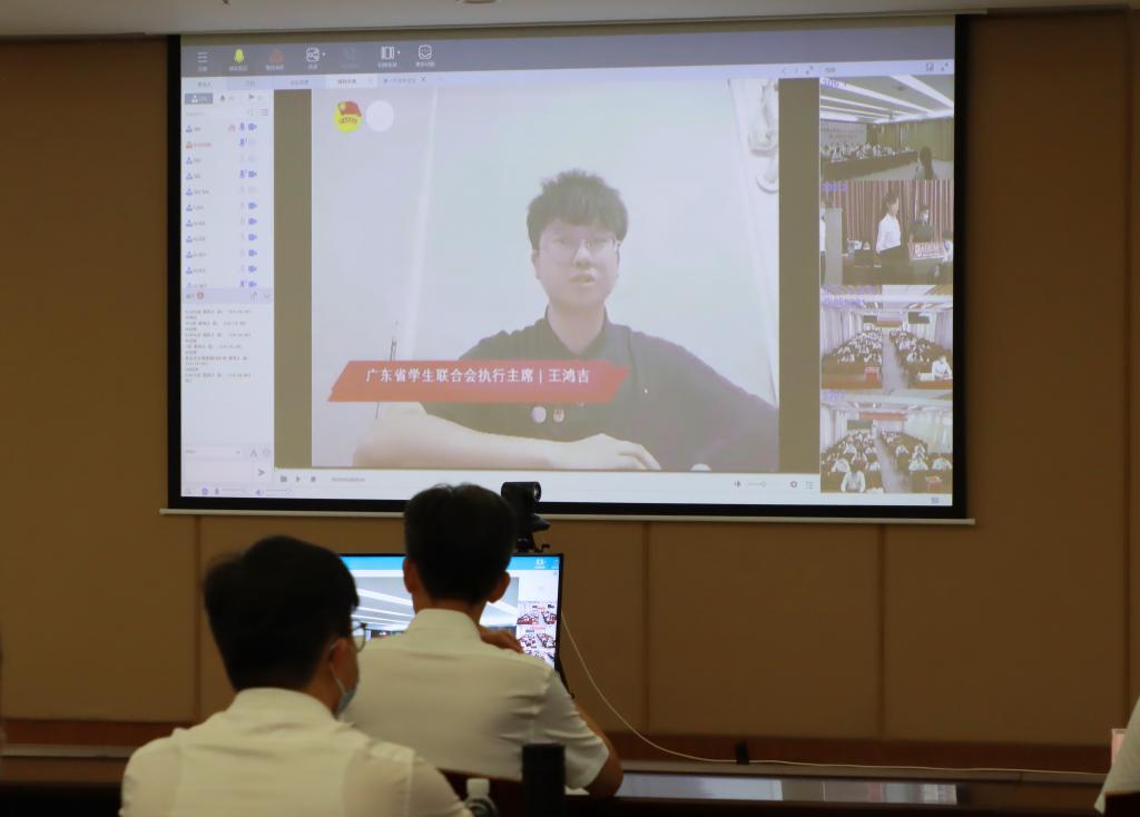大会在庄严的国歌声中拉开帷幕。广东省学生联合会执行主席王鸿吉通过录播视频方式向大会致辞。他表示,广大青年学生骨干应恪守学生本分,永葆理想情怀,勤勉务实做事,营造平等氛围,摒弃庸俗习气,始终把握全心全意为同学服务的最根本宗旨,坚决做配合学联学生会组织深化改革和促进他人的行动派,希望学校全体同学坚定信念,求真务实,积极投身新时代中国特色社会主义伟大实践,进一步增强历史使命感和社会责任感,以优异的成绩庆祝中国共产党成立100周年。