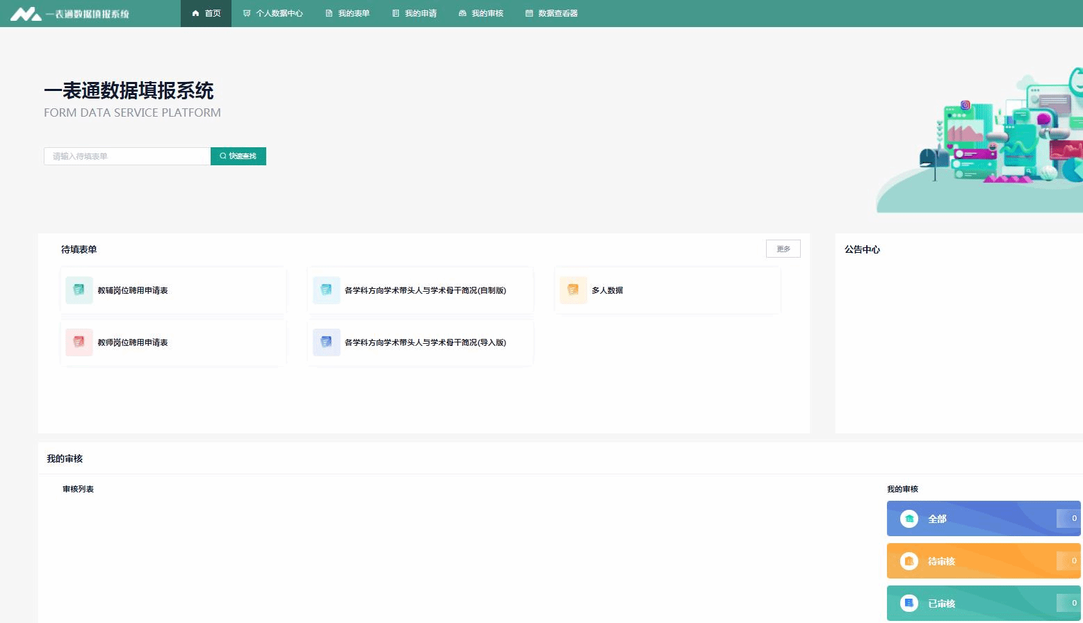 “一表通”系统作为服务于学校师生的在线表单填报、事务流程处理的业务系统,支持师生在线进行表单填报、事务办理。截至11月1日,“一表通”系统已建设21个数据表单涵盖864个数据字段,其中403个数据字段可以自动导出。同时建设41个数据模型信息,接入数据量达18万条,能够对教职工晋升、项目申请、评奖评优等工作的顺利开展提供重要技术支撑。