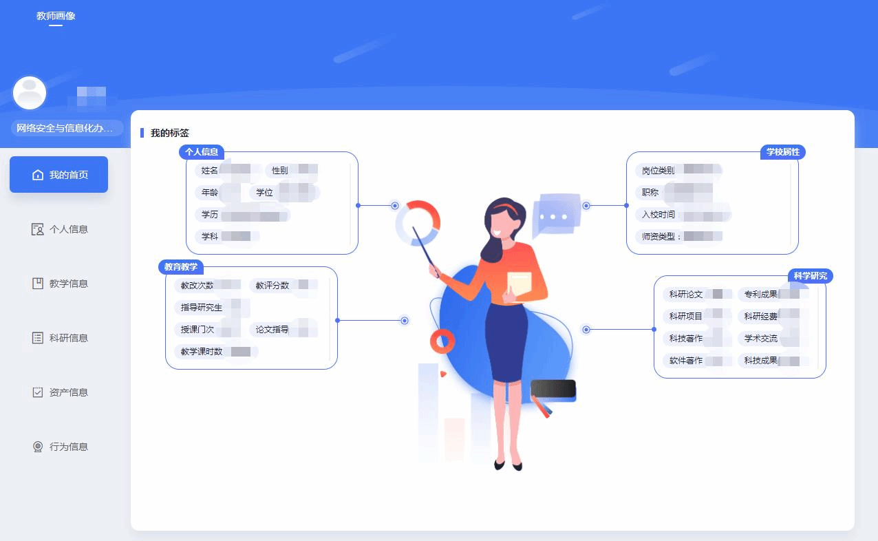 综合画像系统可直观、生动地体现学校数据资产现状,反映学校综合校情,学科发展建设能力,以及师生在校教学、科研、学习、生活等行为状态,助力学校进行基于数据的精准化管理与决策。教职工用户可使用中央认证账号登录综合画像系统,点击查看个人基本信息、教学信息、科研信息、资产信息、行为信息等5大类多个维度个人数据。个人画像通过以上主题数据对教师的各类行为进行画像,通过画像数据可视化,提供多维度的数据分析,为个人提供不同主题的数据一站式查阅服务。综合画像系统中学生画像应用部分后续将适时推出。
