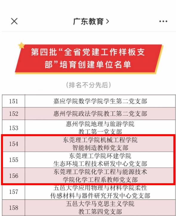 我校获培育创建单位4个,其中,电子工程与智能化学院党委成为第四批“全省党建工作标杆院系”培育创建单位,机械工程学院智能制造教师党支部、生态环境与建筑工程学院生态环境工程技术研发中心党支部、化学工程与能源技术学院化学工程系教师党支部等3个支部为第四批“全省党建工作样板支部”培育创建单位。