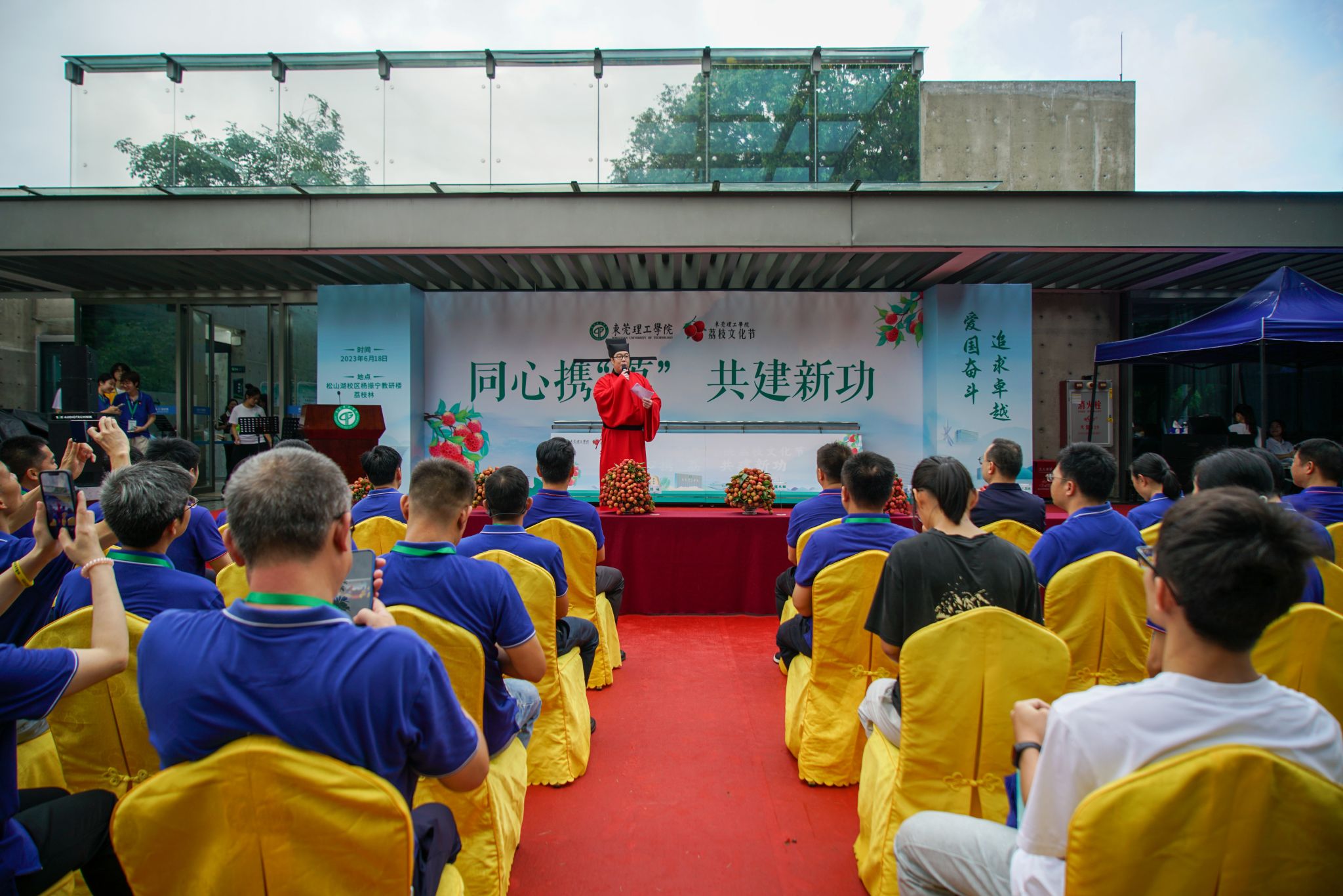 杨振宁教研楼前,莞工总务后勤部为大家带来了一场荔枝文化盛宴。党委委员、副校长李文芳为荔枝节开幕式致辞,马克思主义学院郭俐兵老师围绕荔枝开讲,教育学院(师范学院)学子带来主题表演,6000斤荔枝及蛋挞、麻薯、曲奇、特色文创周边现场派发。莞工师生、来访人员共尝美味荔枝,同品荔枝文化,体验荔枝采摘的乐趣。