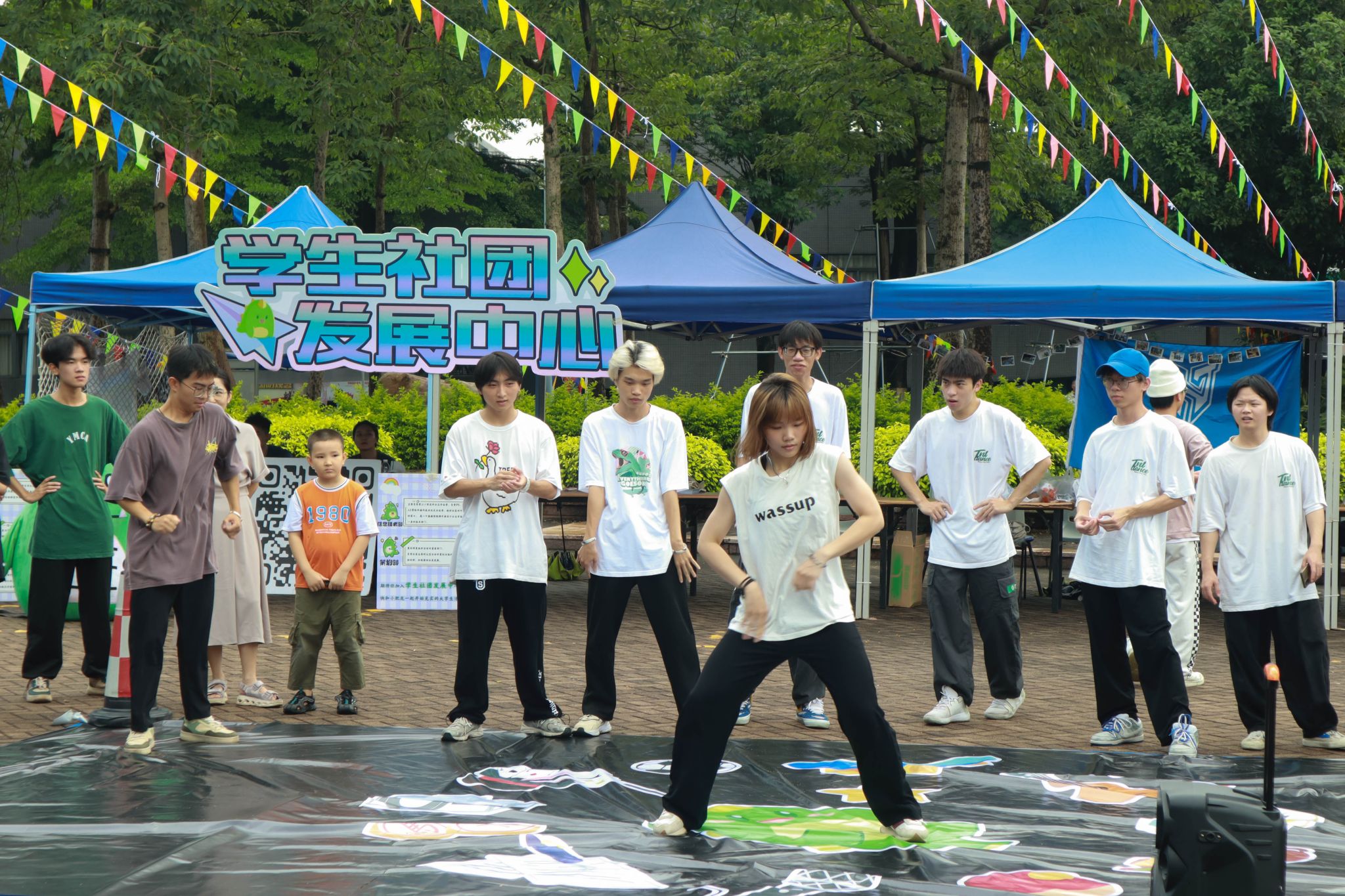 TNT街舞协会、YMCA协会等莞工特色社团和备受同学们喜爱的“小肥龙”人偶“快闪”亮相松山湖校区图书馆前,一展莞工社团的青春风采,吸引了不少家长和考生驻足观看。