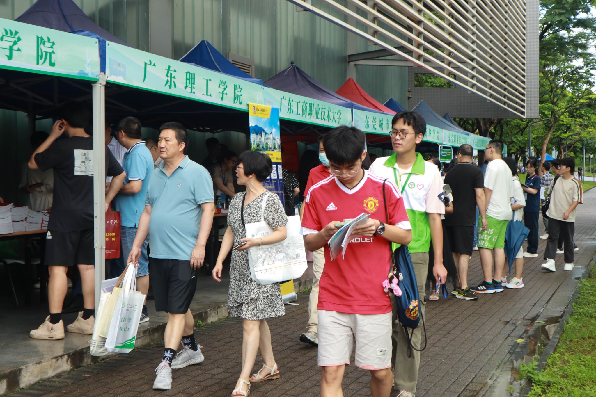 尽管“龙舟水”阵阵,依然吸引了大批考生、家长到场。各学校接待点前人声鼎沸,考生、家长围绕专业、排名、就业前景等问题仔细咨询,各校招生工作人员手拿本校招生资料,耐心认真地解答问题,莞工志愿者在校园穿梭奔忙,积极地为来访的考生及家长引路、答疑。