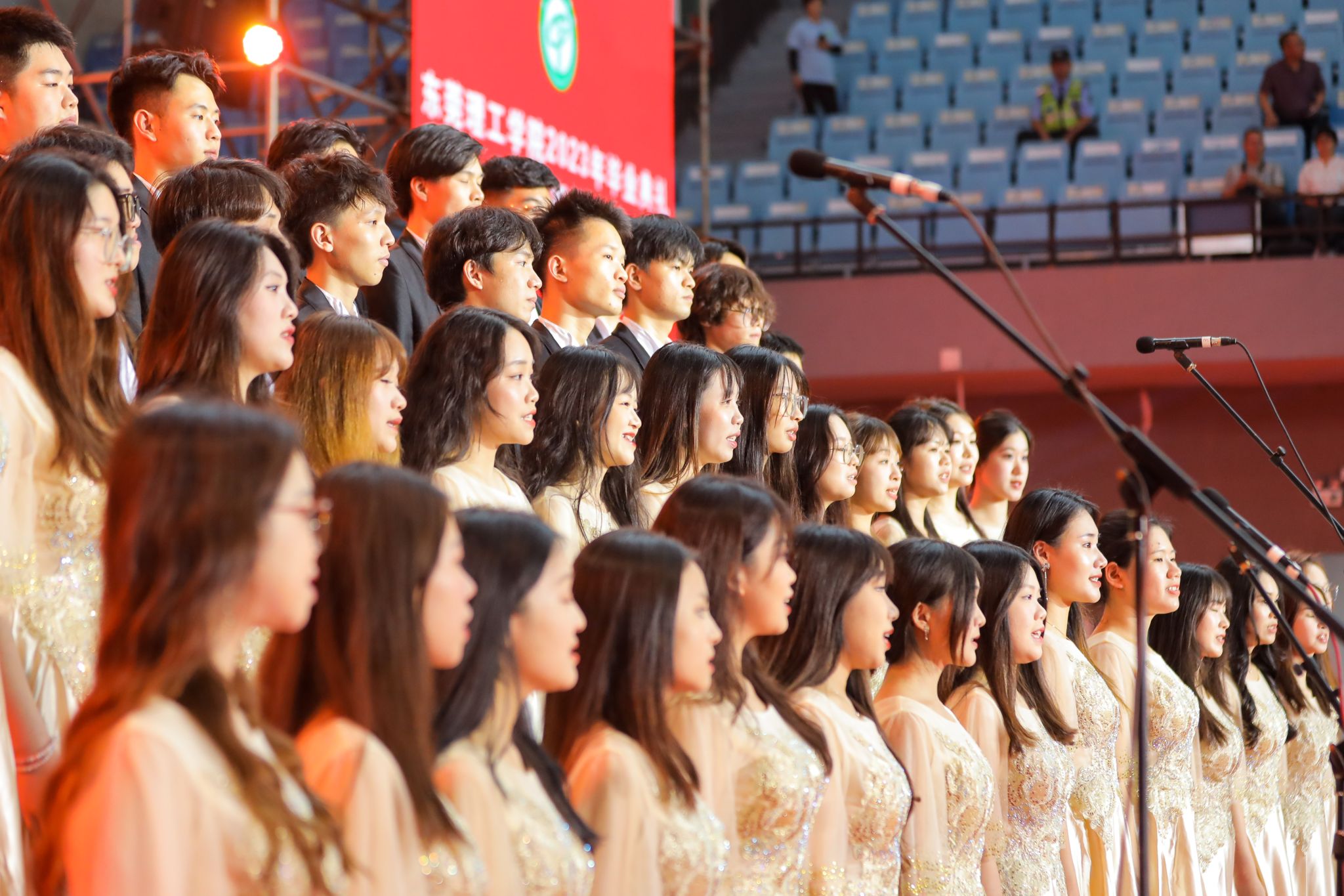 毕业典礼开始前,莞工大学生合唱团和学校艺术团的同学们演唱了歌曲《我们有一个梦想,叫青春》《知足》和《再见》,以歌声送别今年毕业的师兄师姐们。其中《我们有一个梦想,叫青春》是我校校园歌曲创作大赛金奖获奖作品,由我校教育学院(师范学院)颜乐老师创作。本次毕业典礼,也是该作品首次亮相,以歌声鼓励即将走出校门的莞工学子永葆初心,乘风破浪,逐梦新征程。