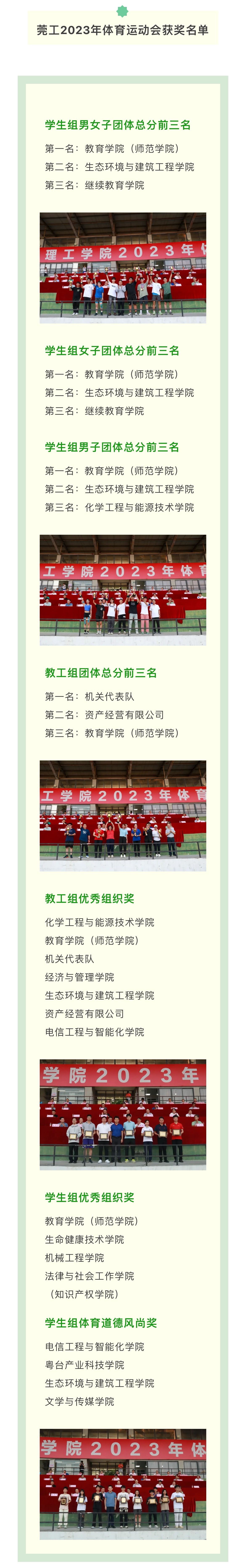 本次运动会中,教育学院(师范学院)、生态环境与建筑工程学院、继续教育学院分别获得学生组男女子团体冠、亚、季军,教工组团体的冠、亚、季军则由机关、资产经营有限公司、教育学院(师范学院)三个单位夺得。