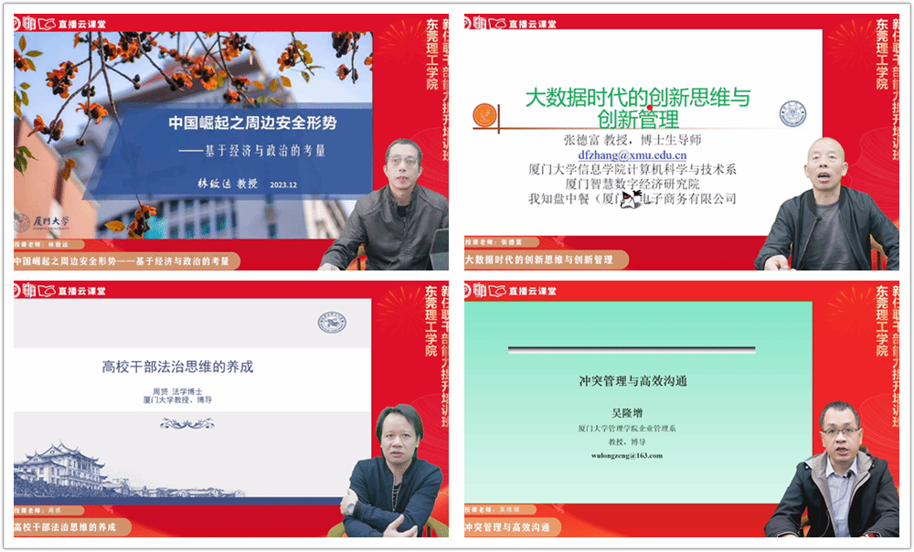 厦门大学信息学院教授、博士生导师张德富作“大数据时代的创新思维与创新管理”主题报告,他带领大家学习了党的二十大报告有关科技的内容,围绕大数据在创新思维中的应用、大数据时代培养创新思维的方法、如何激发创新活力等方面进行详细的讲解,帮助学员们培养创新思维,发挥主观能动性和创造性,利用好新技术、新工具,提高工作效率和生活质量。厦门大学经济学院教授、财政部财政政策研究专家、教育部哲学社会科学重大攻关项目首席专家林致远以“中国崛起之周边安全形势——基于经济与政治的考量”为题,拓宽了学员们的视野,让学员们对国际形势有了更为深入的认识。厦门大学法学院教授、博士生导师周赟生动有趣地讲授“高校干部法治思维的养成”,从法治思维的起点、核心,对法治意识、程序导向进行剖析,提醒学员们深刻认识“用好程序”“留好档案”等具体的依法治校措施的重要性。厦门大学管理学院企业管理系教授、博士生导师吴隆增作“冲突管理与高效沟通”专题报告,他围绕人际冲突管理、人际沟通艺术、圆通的人际关系等方面进行了生动的讲解。